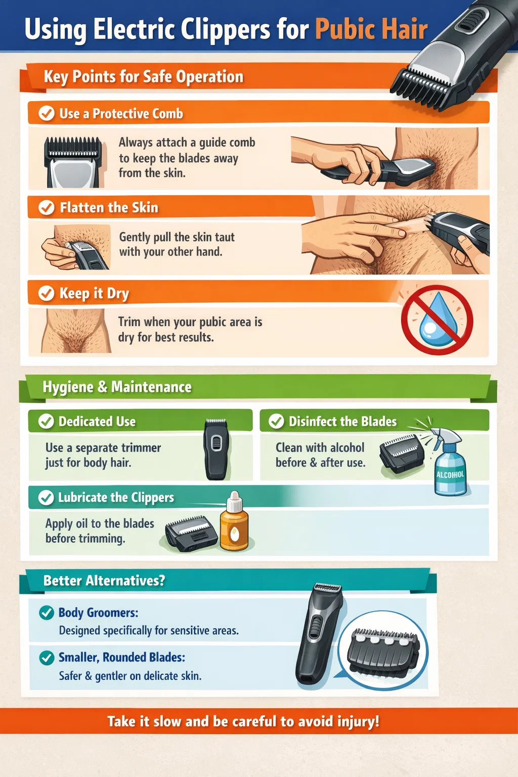 Om du planerar att använda elektriska klippmaskiner för att sköta ditt blygdparti, var uppmärksam på följande punkter för att säkerställa komfort och säkerhet: